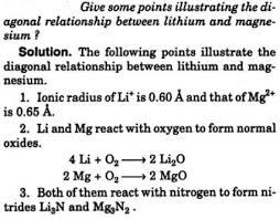 Thus, the chemistry of Li has similarities to that of Mg, the chemistry of Be has similarities to that of Al, and the chemistry of B has similarities to that of Si. These are called diagonal relationships. (NB: It is not as noticeable after B and Si) The reasons for the existence of diagonal relationships are not fully understood, but charge density is a factor. For example, Li+ is a small cation with a +1 charge and Mg2+ is somewhat larger with a +2 charge, so the charge density on each ion is roughly the same. Using the Li–Mg pair:(under room temperature and pressure)